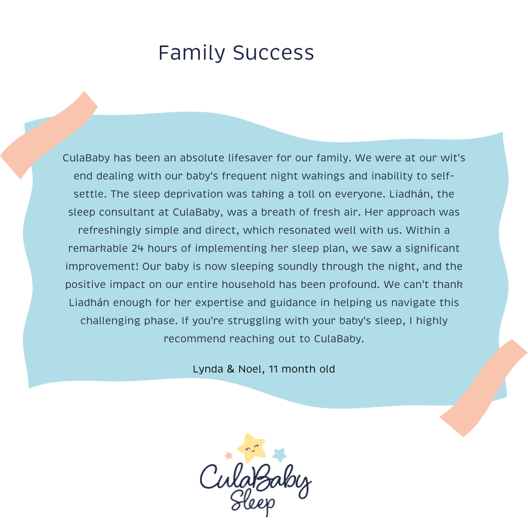 "CulaBaby has been an absolute lifesaver for our family. We were at our wit's end dealing with our baby's frequent night wakings and inability to self-settle. The sleep deprivation was taking a toll on everyone. Liadhán, the sleep consultant at CulaBaby, was a breath of fresh air. Her approach was refreshingly simple and direct, which resonated well with us. Within a remarkable 24 hours of implementing her sleep plan, we saw a significant improvement! Our baby is now sleeping soundly through the night, and the positive impact on our entire household has been profound. We can't thank Liadhán enough for her expertise and guidance in helping us navigate this challenging phase. If you're struggling with your baby's sleep, I highly recommend reaching out to CulaBaby" Can can read the review here for yourself